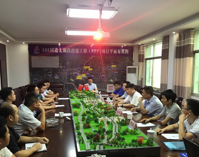 会上,许总一行通过观看国道航拍视频和听取工作汇报的形式对105国道改建项目进行了深层次的了解。相关领导对太湖105国道改建工程PPP项目当前取得的工作成绩予以高度认可,希望全体参建人员继续努力,共同将集团在安庆地区的首个PPP项目打造成为安徽建工品牌工程。许克顺强调:一要加强沟通,全力推进项目进度。项目公司要紧密配合政府方,加强沟通协作,推进项目征地拆迁进程,为工程全面实施和实现既定工程责任目标提供保障;二要优化管理,着力防控投资风险。从优化组织管理和施工管理方面入手,加快施工进度,争取早日运营,确保投资收益;三要抓好党建,持续抓好党风廉政建设。要严明纪律、恪守规矩,时刻绷紧政治纪律和政治规矩这根弦,严格遵守党章和党内政治生活准则,不断增强政治警觉性和政治鉴别力,扎实开展好“讲忠诚、严纪律、立政德”专题警示教育活动,以鲁炜案和徽商集团窝案等严重违纪行为为戒,引导党员干部和全体职工牢记党的宗旨,筑牢思想政治道德防线,提高拒腐防变的能力。
