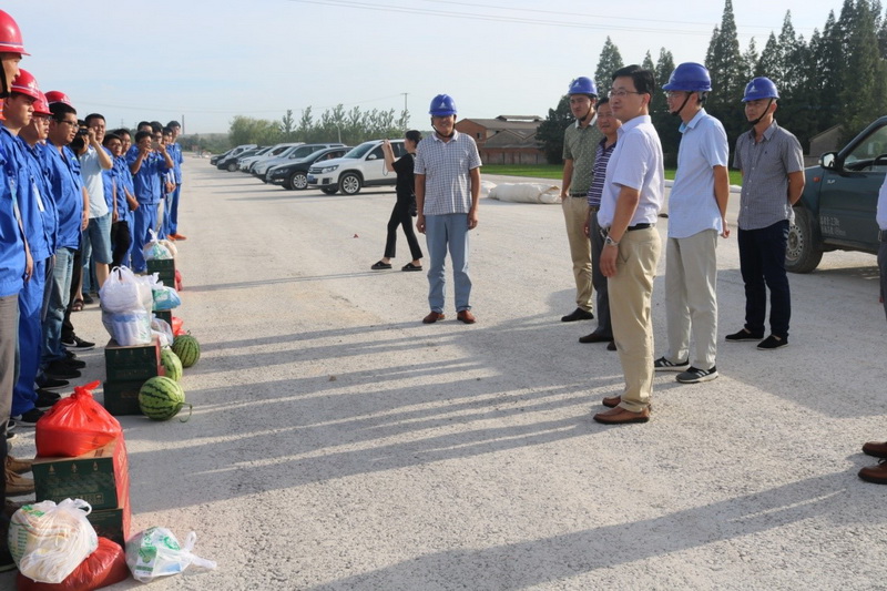 在工地现场,钱会副县长等向一线施工人员送去了西瓜、矿泉水、风油精、十滴水、人丹等防暑降温慰问品。他详细地询问了工程概况并对做好高温天气下的安全施工工作提出两点意见:一是相关负责人要做好防暑降温部署,通过调整作息时间,配备纳凉休息区域等方式确保高温施工安全;二是现场施工人员要做好自我调节,确保工程有序推进。 炎炎夏日,慰问组一行的关心,让一线员工备受鼓舞,他们纷纷表示将以更加饱满的工作热情投入到本职工作中,为打造一流安徽建工作出新的贡献。