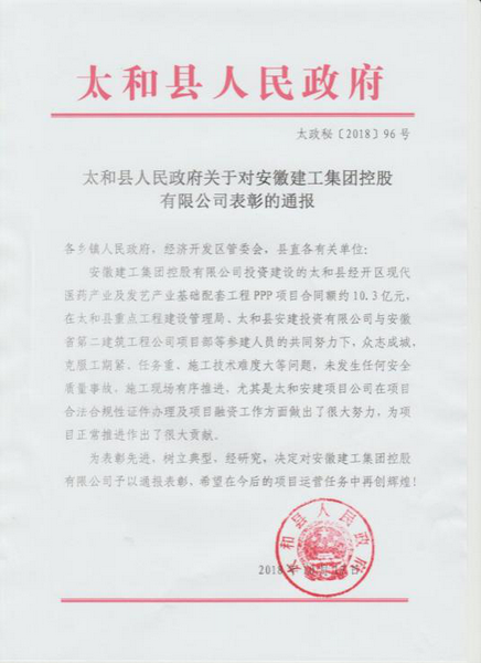 2018年10月17日,安徽建工集团控股有限公司投资建设的太和县PPP项目喜获太和县人民政府全县通报表彰!