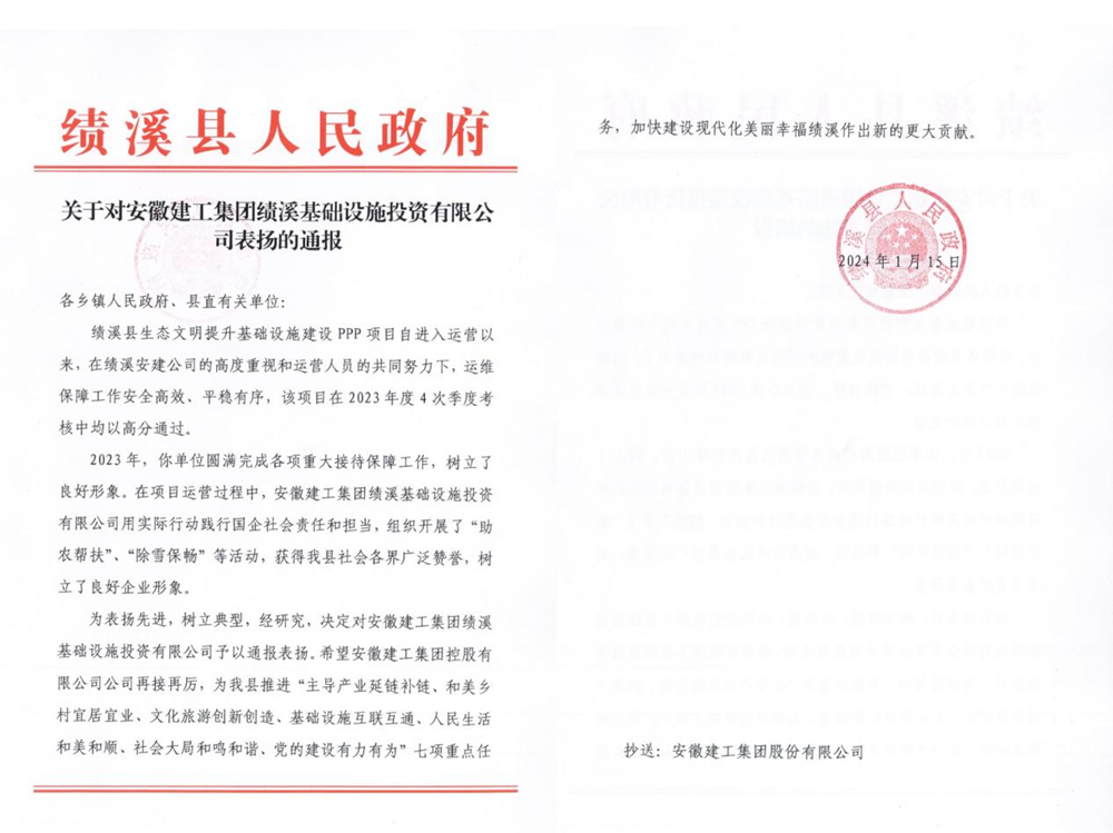 1月15日,建工投资绩溪项目公司喜获绩溪县人民政府通报表扬,充分肯定了项目公司2023年运营管理工作取得的优异成绩。