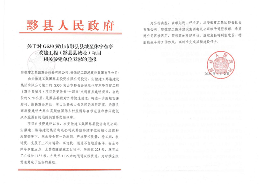 近日,建工投资所辖安徽建工集团黟县投资有限公司受到黟县人民政府通报表彰,充分肯定了项目公司在G530改建工程中所取得的突出成绩。