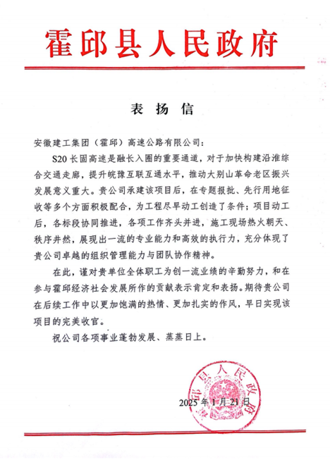【“投”条喜报】建工投资S20长固高速霍邱至皖豫界段项目喜获霍邱县人民政府通报表扬