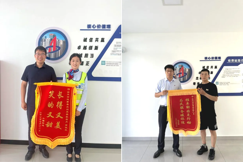 徐淮阜高速萧县北及淮北西收费站接连收到司乘人员赠送的锦旗,安徽高速“96566”服务热线收到对淮北西收费站工作人员的表扬电话,智慧监控中心也收到对司乘人员的感谢电话,一次暖心助困、一次热情服务、一个真诚微笑都展现出全体建工高速人的坚守与担当。